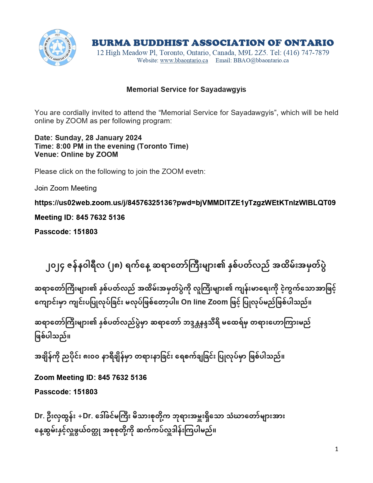 ⚠️ Event Cancellation Notice - Ceremony of Memorial Blessings and Dhamma Talk in Honour of Mahādhammika Sayadawgyis ⚠️